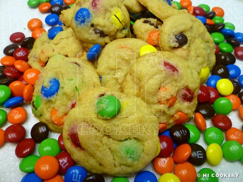 Fold in the M&Ms, reserving a few to press onto the top the cookies (optional). Scoop one-inch balls onto a lightly greased baking sheet, leaving them about two-inches apart. Flatten slightly for flatter cookies (optional). Bake in a preheated oven at 350 degrees F for 10-15 minutes. Remove from the oven and cool completely. Yield: Approximately 4 dozen cookies.
