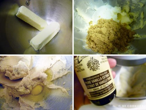 In a large bowl, cream the butter with the brown and white sugar until smooth. Beat in the egg. Stir in the vanilla.