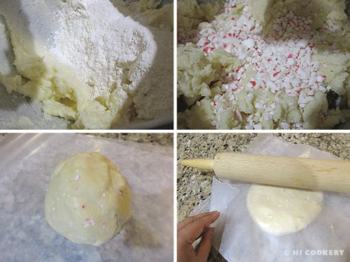Gradually add the dry ingredients to the wet ingredients. Mix until a sticky dough is formed. Fold in the crushed candy cane, being careful not to overmix of the dough will turn pink. Roll out dough out into a ball and divide in half. Flatten each ball into a circle between two pieces of waxed paper.
