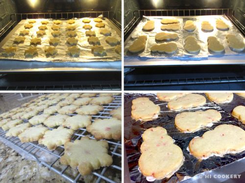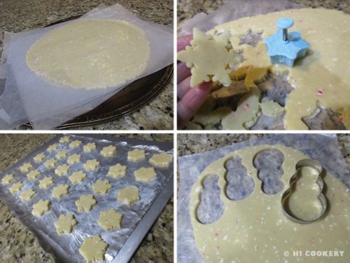 Use a rolling pin to roll to a thickness of ¼ inch. Stack the rolled dough on top of each other and refrigerate until firm (about an hour). Take out one of the flattened dough from the refrigerator. Cut into shapes with cookie cutter. Place on a greased baking sheet two-inches apart.