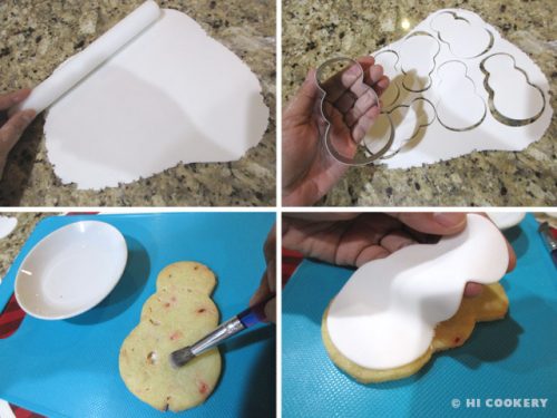 Dust a clean work surface with a little powdered sugar or cornstarch to prevent the fondant from sticking. Knead some white fondant until pliable. Roll out very thin (about 1/16 inch). Cut out snowperson shapes and keep covered in a plastic zipper top bag to prevent from drying out. Brush water on a snowperson cookie. Press the fondant piece on top, gently stretching to fit the edges as necessary. Repeat with all other cookies.