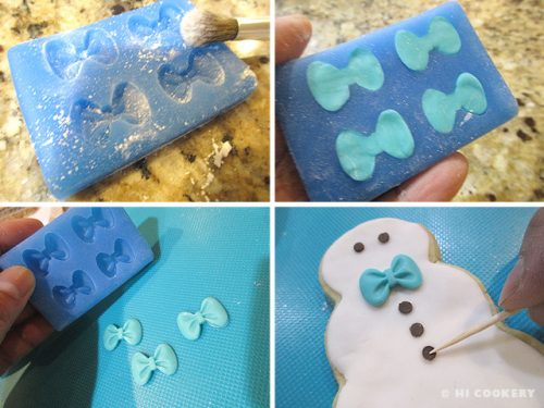 Dust the bowtie/ribbon mold with a little powdered sugar or cornstarch to prevent the fondant from sticking. Knead some blue fondant until pliable. Press into the bowtie/ribbon mold. Flatten the back or trim away the excess. Unmold. Add a little water with a thin brush on the white fondant to position the bowtie. Finish adding the buttons in the same manner as the eyes.