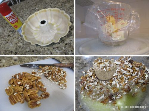 Generously coat a Bundt or ring pan with cooking spray. In a bowl, combine the melted butter, chopped pecans and brown sugar. Mix well.