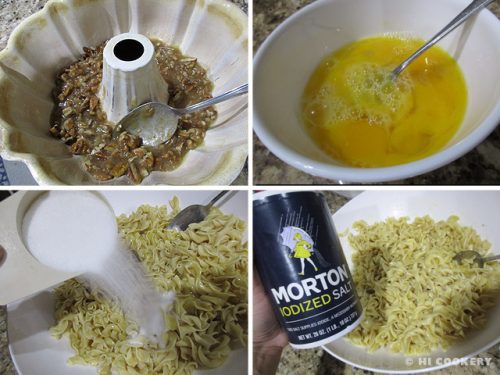Spoon the brown sugar mixture on the bottom of the prepared pan. Beat the eggs and mix with the noodles in the bowl. Stir in the white sugar and salt.