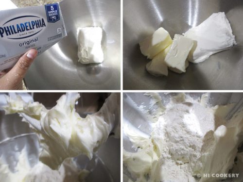 In a large mixing bowl, mix the cream cheese with butter until soft and creamy.