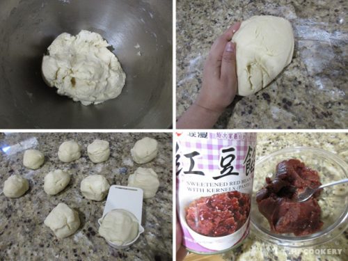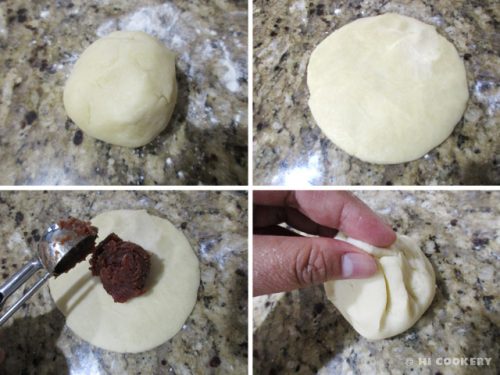 Roll and flatten the dough. Fill each with 2-3 tablespoons of red bean paste. Gather up the edges and pinch the seams to encase the filling. Roll on the surface to smooth it out.