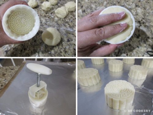 Prepare a baking sheet by lining it with foil and lightly misting it with cooking spray. In a lightly floured moon cake mold, place the filled dough inside, using fingers to spread the dough to the side edges of the mold. Press the mold onto the baking sheet and release.