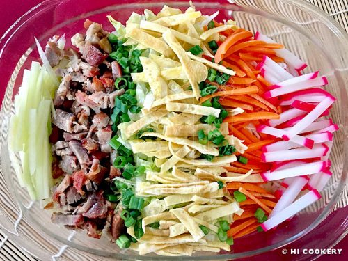 One of the most colorful, attractive and popular potluck dishes in Hawaii is somen salad, a cold wheat noodle dish topped with slivers of fried egg (tamago), meat (char siu, ham or Spam), fish cake (kamaboko) and vegetables. The dressing is a sweet soy-vinegar sauce that complements this salad well. As a side dish, it is light enough to eat with an entrée. As the main meal, it is hearty and satisfying enough but not heavy. Somen salad can be prepared ahead of time and people can assemble the ingredients they prefer for themselves. But it is the presentation of all the toppings that make this a pretty and picture-perfect food.
