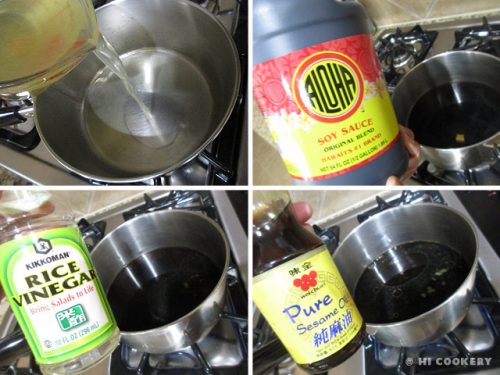 In a saucepan, combine the chicken broth, vinegar, soy sauce and sugar. Add the sesame oil. Bring mixture to a boil and stir until the sugar is dissolved. Remove from heat and let cool. Save for later (we bottle and refrigerate the rest).