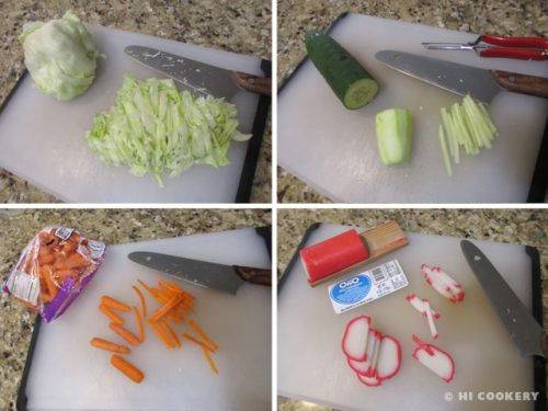 Shred the lettuce. Chop the cucumbers and carrots into strips. Cut the fish cake into strips.