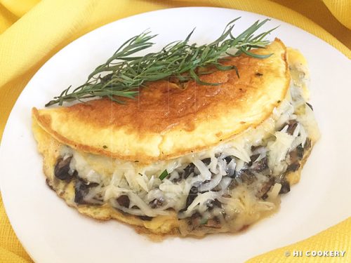 Put the shallots/mushrooms mixture on one half side of the eggs and cook until slightly set. Sprinkle the grated cheese over the mixture. Fold the other half of the egg over and cook for another minute until the cheese has melted a little bit. Slide the omelet onto a plate. Sprinkle with fresh chopped tarragon or garnish the top with a sprig of fresh tarragon. Serve hot for two people.