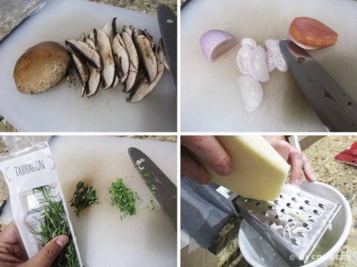 Prepare the filling for the omelet by slicing the portabella mushrooms and shallot, chopping the tarragon and grating the cheese.