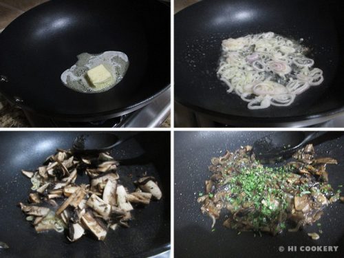 Season with salt and pepper. In a nonstick skillet, melt 1 ½ tablespoons of butter over medium high heat. Sautee the sliced shallots until wilted and brown. Add the slices portabella mushrooms and cook until softened (around 5 minutes). Sprinkle the tarragon over the shallots/mushrooms mixture. Season with salt and pepper and cook a minute more. Transfer to a plate.