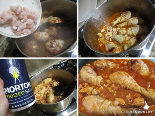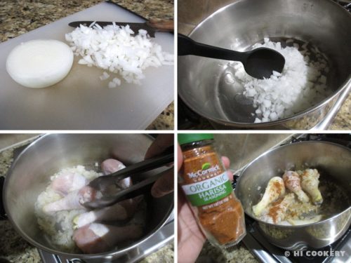 In a large pot, saute the onions in oil over medium high heat until translucent. Add the chicken legs and brown the skin. Sprinkle harissa spice.
