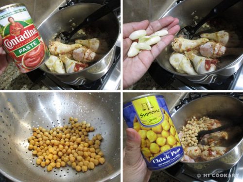 Add the tomato paste, crushed garlic and drained chickpeas.