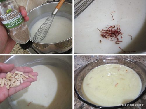 Stir in the ground cardamom, saffron threads and silvered almonds. Cook for another minute or two. Transfer the pudding to a larger bowl, cool to room temperature, cover and refrigerate for at least an hour. Ladle into dessert dishes or serving bowls. Garnish with chopped pistachios.