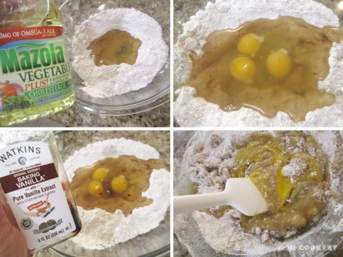 Mix in the oil, eggs and vanilla and stir until moistened.