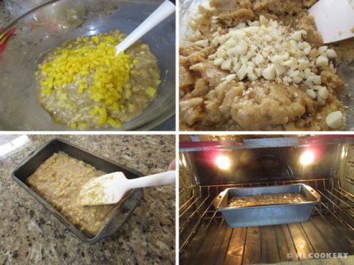 Fold in the mango bits and their juices until well combined. Stir in the macadamia nuts. Place batter in a well-greased large loaf pan. Bake in a preheated oven at 350 degrees F for 45-55 minutes, testing for doneness with a toothpick.
