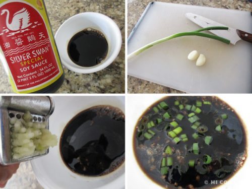 In a small bowl, combine the soy sauce, garlic and green onions .