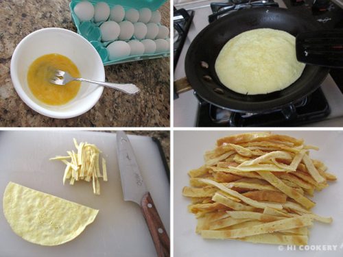 Beat the eggs and fry into an omelet in a lightly greased skillet. Cool, cut in half and slice thinly into slivers. Set aside.
