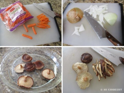 Cut the carrots into “match sticks”. Slice the onions thinly. Rehydrate the dried shiitake mush-rooms in hot water for 10 minutes or until softened. Squeeze out excess water from the mush-rooms and slice thinly.