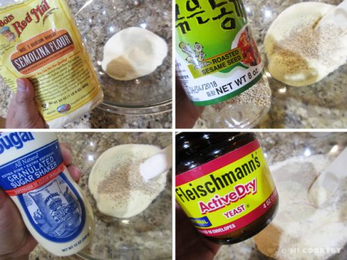In a large bowl, mix together the semolina flour, 2 tablespoons of sesame seeds, sugar and yeast.