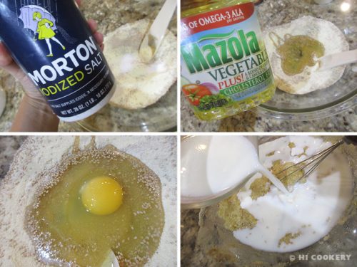 Add salt, oil, 1 whole egg and 1 egg white (save the 1 egg yolk for the egg wash). Stir in lukewarm milk. A liquid dough should form.