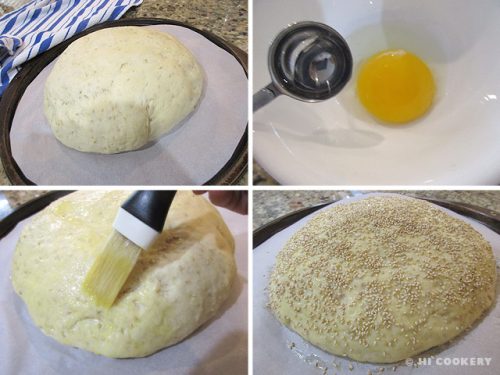 Beat the remaining egg yolk with 1 teaspoon water to make an egg wash. Brush this over the round loaf. Sprinkle with remaining 1 tablespoon of sesame seeds.