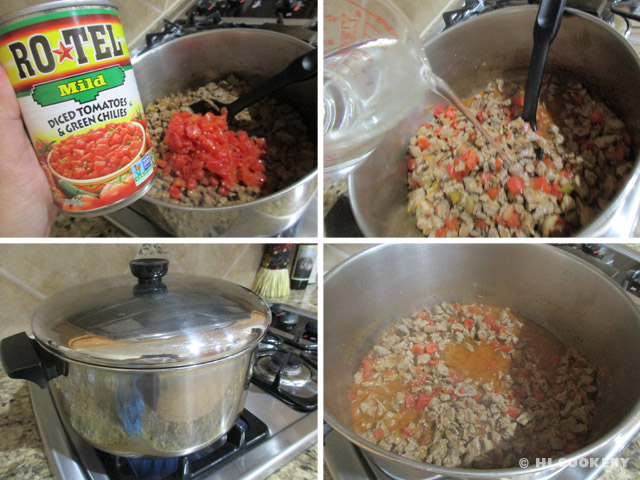 Stir in the tomatoes. Season with hot sauce. Pour hot water and mix. Season with salt and pepper. Bring to a boil, then cover and lower heat to simmer for about an hour until meat is tender. Skim off some fat on the top during cook time and stir. Ladle into bowls and serve hot.