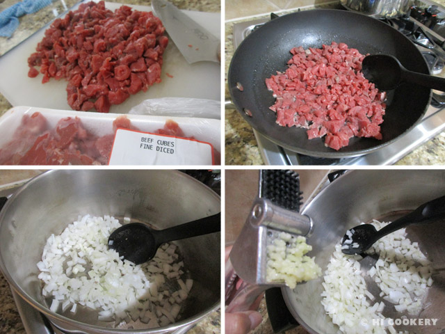 Heat a little oil in a pan and brown the meat. Set aside to drain. In a pot, add a little oil and saute the onions with garlic.