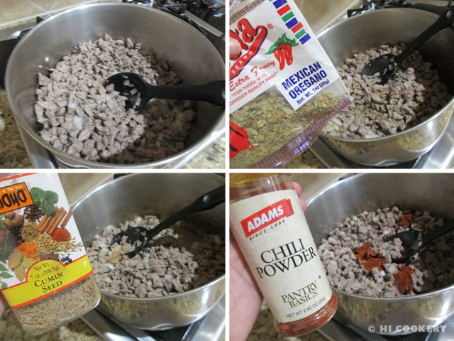 Stir in the meat. Season with oregano, cumin and chili powder.