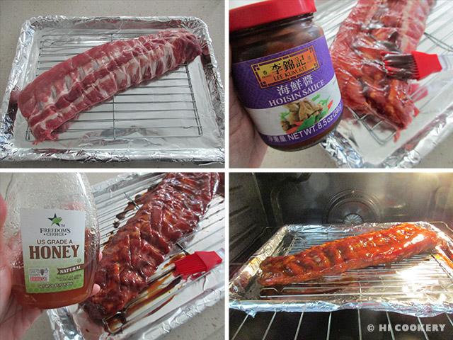 Line a baking pan with foil for easier cleanup. Put a rack on top to lay the ribs. Wash and pat dry the ribs. Trim the fat and tissues. Brush hoisin sauce on both sides of the ribs. Place in the refrigerate uncovered to marinate for 30 minutes to an hour. Brush the ribs with honey on one side. Bake in a preheated oven at 350 degrees F for 30-45 minutes.