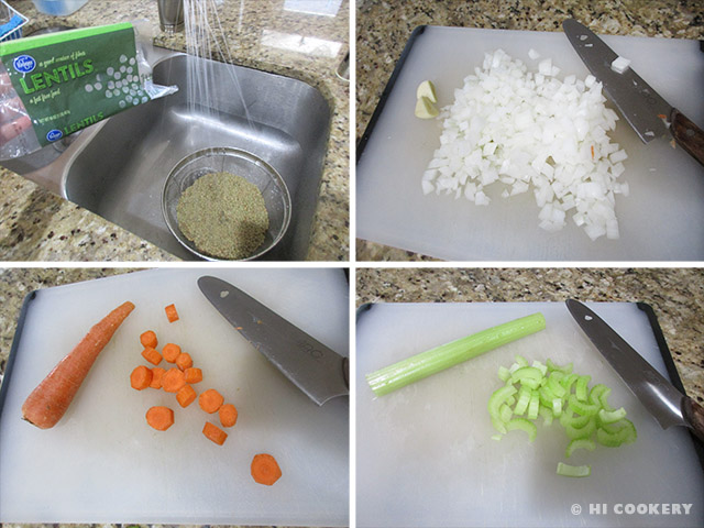 Rinse and drain the dried green lentils in a colander. Set aside. Chop the onions, peel and dice the carrots and chop the celery stalks.