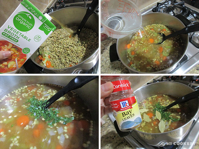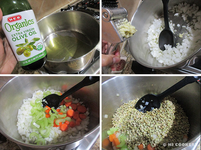 In a large pot, heat olive oil over medium heat. Add the onions, garlic , carrots and celery. Saute until softened (around 5 minutes). Add the green lentils.