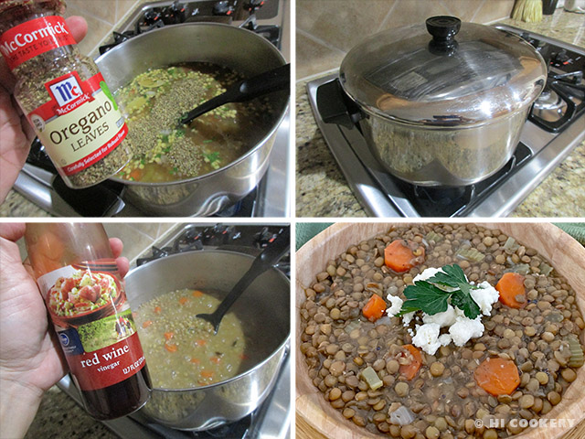 Season with oregano, salt and pepper. Turn the heat to medium low, cover the pot and simmer for 45 minutes. Add a cup or two of water if the lentils absorbed the liquid. Cover, cook for 5 more minutes and adjust salt and pepper seasoning. Uncover and stir in the red wine vinegar. Ladle into soup bowls and serve hot.