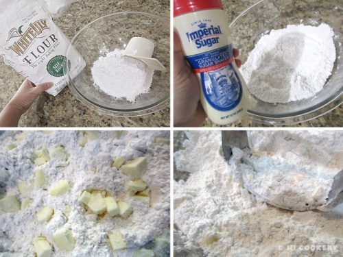 In a large bowl, combine the flour and sugar. Cut the butter into small pieces. Use a pastry cutter to mix the butter into the dough until it resembles peas.