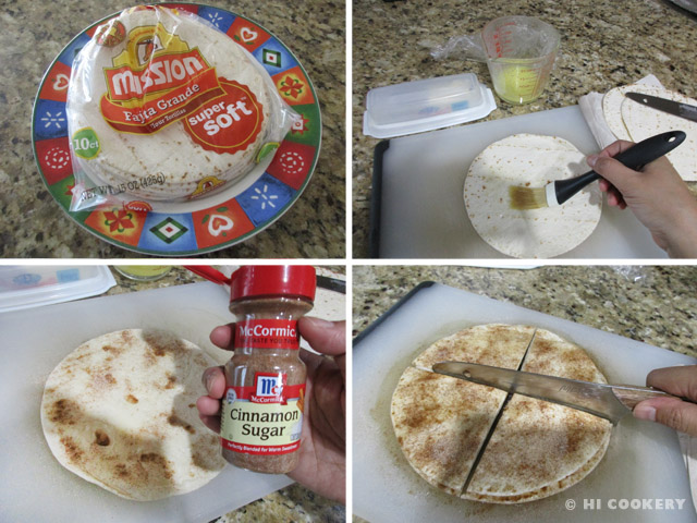 Brush melted butter on both sides of each of the flour tortillas. Sprinkle generously with cinnamon sugar. Stack the tortillas and cut them into 6-8 wedges.