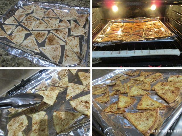 Place them on a baking pan lined with foil or parchment paper (do not overlap the wedges). Bake in a preheated oven at 375 degrees F for 5 minutes. Remove from the oven and turn the wedges on the other side and bake for another 5 minutes. Remove from the oven and allow the butter-cinnamon-sugar mixture to caramelize and the chips to cool to a crisp.