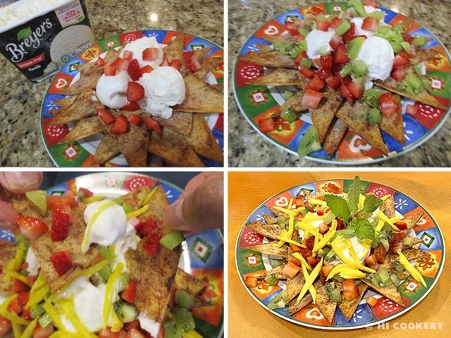 We also enjoy sweet nachos as a dessert after our Mexican meals. The corn tortilla chips are replaced with baked flour tortilla wedges sprinkled with cinnamon-sugar. Toppings include fresh cut fruits to mimic their savory counterparts (strawberry=tomatoes, kiwi=lettuce and cilantro and mango=cheese). We also crowned our dessert nachos with vanilla ice cream to resemble sour cream. It is a colorful confection to share and indulge in, especially on National Nachos Day!
