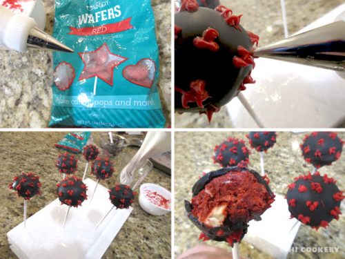 Melt red candy wafers according to the package directions. Fill a pastry bag with slightly cooled melted red candy. Using a small round tip (#2 or #3), pipe random spikes around the chocolate covered cake ball. Refrigerate to set.