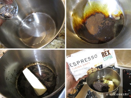 In a saucepan dissolve the espresso powder in water. Add the butter and chocolate espresso chips. Melt over low heat.