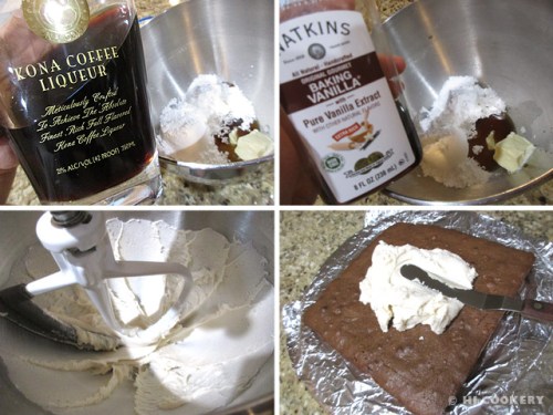 In a mixing bowl, cream the butter with powdered sugar. Add the boiling water and mix until smooth. Thin out the frosting to a spreadable consistency by adding the coffee liqueur and vanilla. Spread on the cooled brownies.