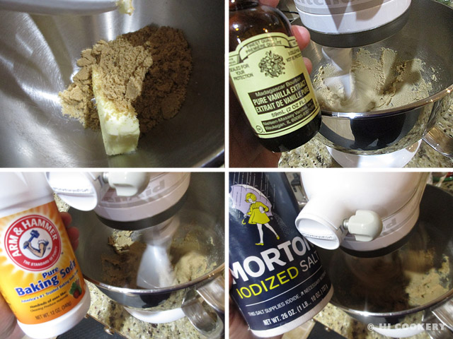 Cream the butter with the brown sugar. Add the vanilla. Stir in the baking soda and salt.