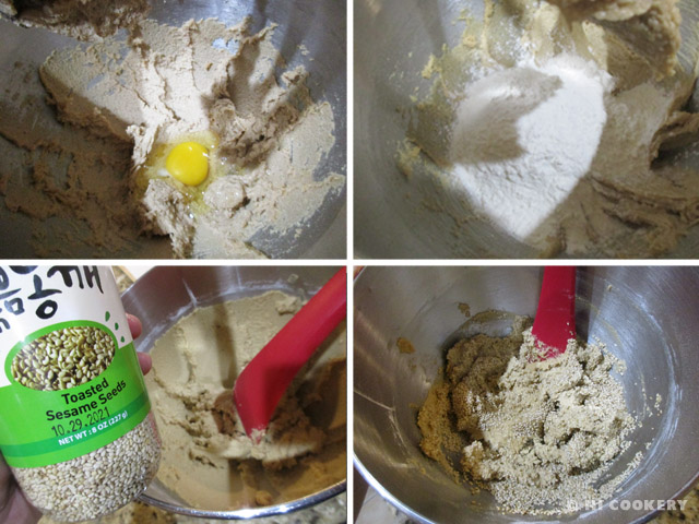 Beat in the eggs. Gradually mix in the flour. Fold in the sesame seeds. Blend well.