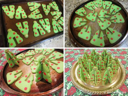 Place on foil-lined greased cookie pan about 1 ½ – 2 inches apart. Refrigerate the cookie pan. Re-roll scraps of dough and cut more shapes, refrigerating if the dough gets too soft. The dough needs to be cold and firm in order to retain its Christmas tree shape. Bake the cookies in a preheated oven at 350 degrees F for 10-15 minutes or until the sides are very lightly browned. Remove from the oven when done and let sit on the pan for about five minutes. Transfer each cookie on a wire rack to cool completely.