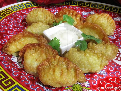 Place between sheets of waxed paper. Freeze for 30 minutes to hold its shape (optional). Deep fry in hot oil at 350 degrees F until golden brown and crispy. Drain on paper towels. Serve with sauce (sweet and sour, duck, chili or hot mustard).