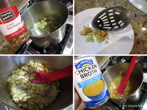 Add the red pepper flakes and season with salt and pepper to taste. Continue to saute the garlic until it changes color but do not brown or it will become bitter. Remove garlic chips to a plate and set aside. In the same pot, add the drained garbanzo beans. Cook on medium high heat. Smash a bit of the garbanzo beans, leaving a few whole.