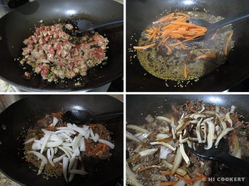 Heat a little oil in a large skillet and sauté the beef until browned. Transfer to a plate and keep warm. In the same skillet, stir-fry the garlic, red and green onions and ginger till fragrant (about a minute). Stir in the aji Amarillo paste. Add the tomatoes and bell pepper and saute gently for another minute.