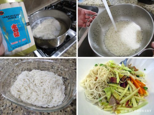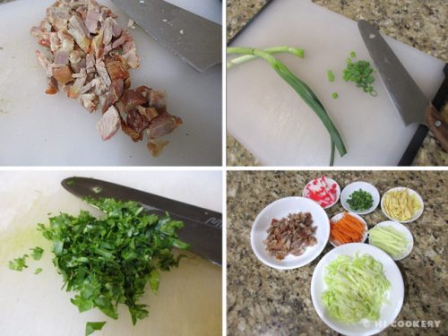 Cook noodles al dente, drain and set aside. Mince the garlic, grate the ginger and slice the red and green onions, tomatoes and bell pepper.