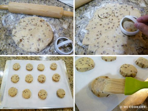 Blend in three tablespoons of chopped crystallized ginger. In a separate cup, beat the egg yolk with almond milk. Pour in the milk mixture into the flour and blend until smooth, being careful not to overwork the dough. Turn out dough onto a clean, slightly floured surface. Knead four or five times (if too dry, add a little more almond milk mixture; if too wet, add a little more flour).